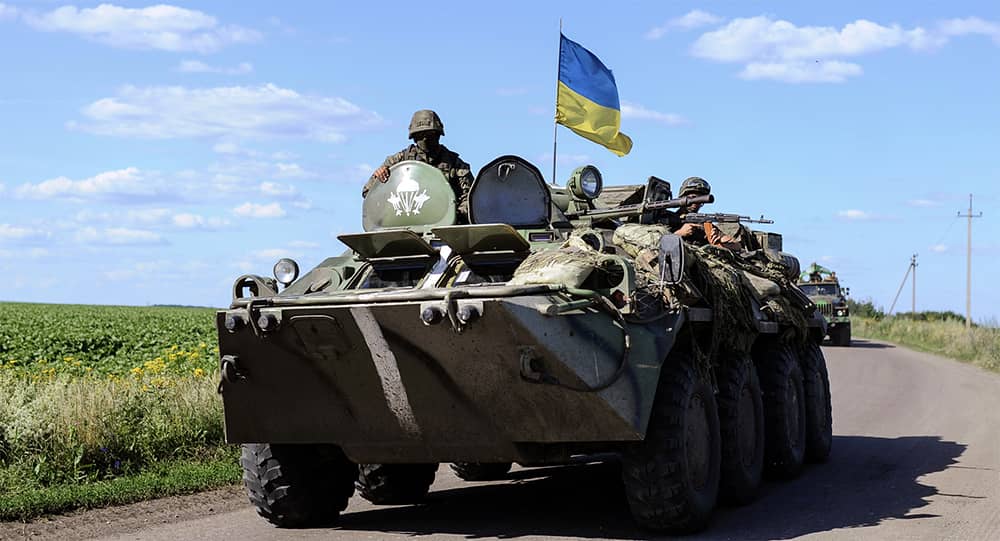Ukrainian soldiers drive a military vehicle with a Ukrainian flag in eastern Ukraine. Credit: REUTERS.