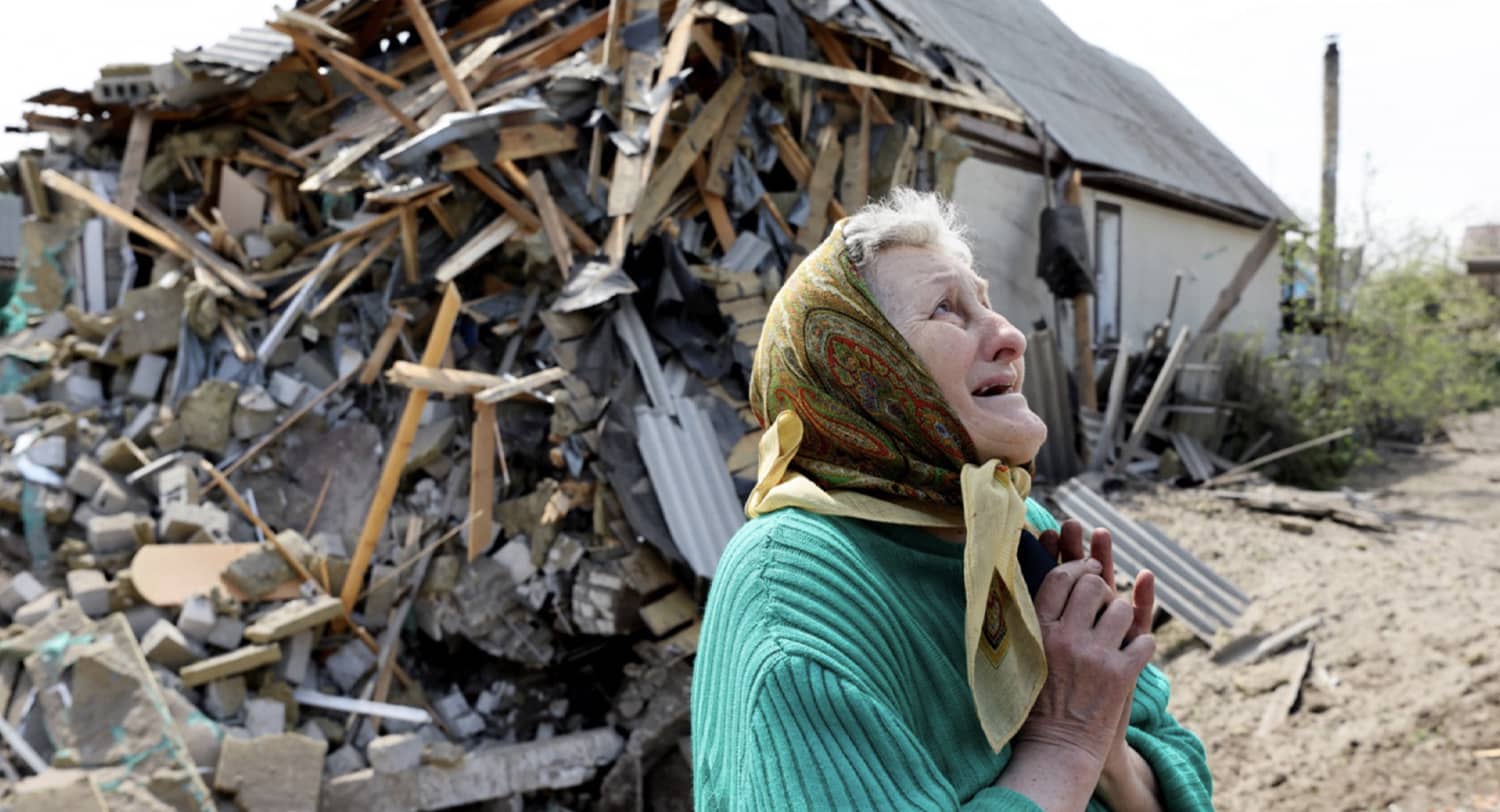 Ukrainian woman in front of a destroyed house in Lyman, Ukraine, Photo credit: REUTERS