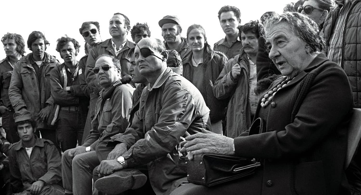 Prime Minister Golda Meir, accompanied by Defense Minister Moshe Dayan, meets with Israeli soldiers at a base on the Golan Heights during the 1973 Yom Kippur War. Photo credit: REUTERS