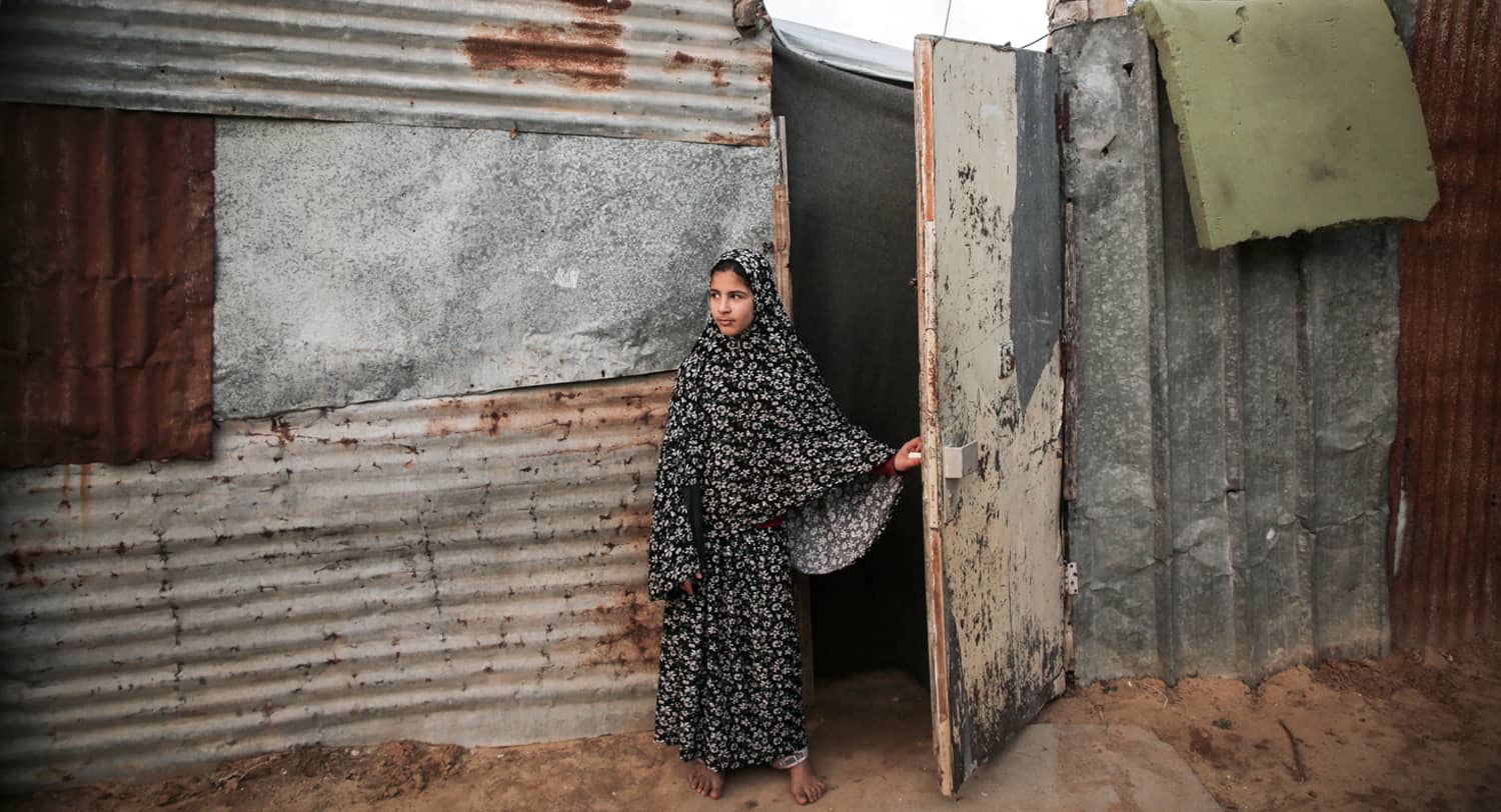 A Palestinian girl stands outside her family’s home in a poor neighborhood in Beit Lahia, northern Gaza Strip, December 2022. Photo credit: Majdi Fathi via Reuters Connect.
